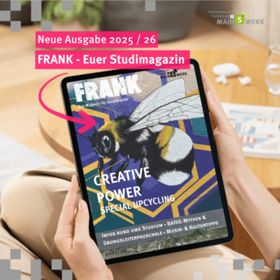 FRANK - Das Studimagazin mit Neuigkeiten aus dem MainSWerk sowie Tipps zu unseren Angeboten und dem Studierendenleben im Rhein-Main-Gebiet. Online oder in den Auslagen unserer Mensen und Cafés.