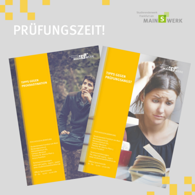 Seid Ihr Typ Prüfungsangst oder neigt Ihr zur Prokrastination? Unsere Psychosozialberatung hat in kleinen Leitfäden einige Tipps zusammengefasst, die Euch gut durch die Prüfungen bringen. Hier zum Download oder im ServiceCenter zum Mitnehmen,