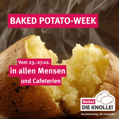 Unsere Initiative „Rettet die Knolle“ startet gleich mit einem Knaller: Vom 23. bis 27. Februar wird es in unserer Baked Potato-Aktionswoche heiß, sättigend und natürlich kartoffelig-lecker. Freue Dich auf täglich wechselnde Baked-Potato-Gerichte.