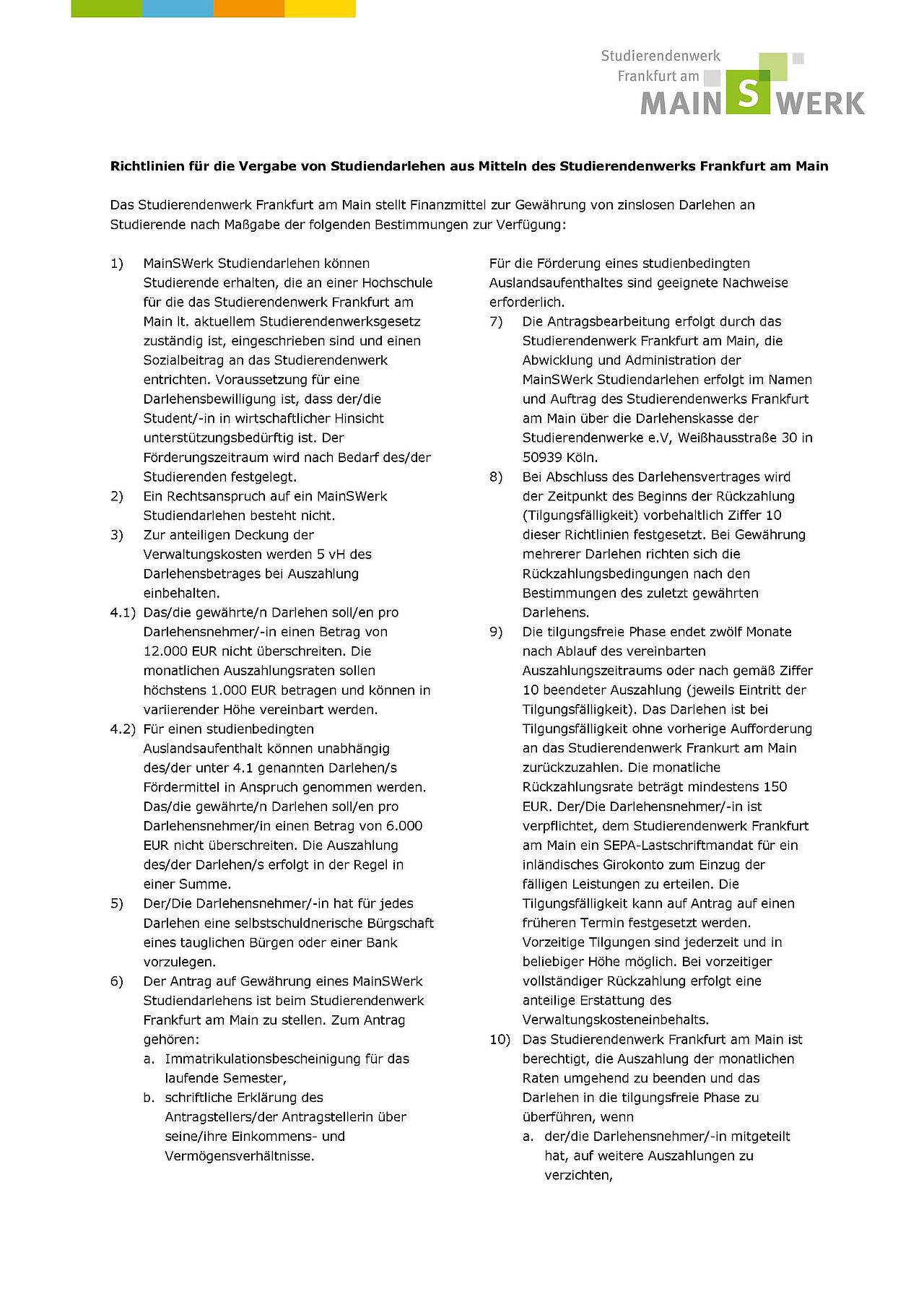 Ein MainSWerk-Studiendarlehen erhalten Studierende, die in wirtschaftlicher Hinsicht unterstützungsbedürftig sind. Das Darlehen ist in voller Höhe zurückzuzahlen. Der Förderungszeitraum wird nach Bedarf des/der Studierenden festgelegt. Die darlehensnehmende Person hat für jedes Darlehen eine selbstschuldnerische Bürgschaft einer bürgenden Person oder einer Bank vorzulegen.