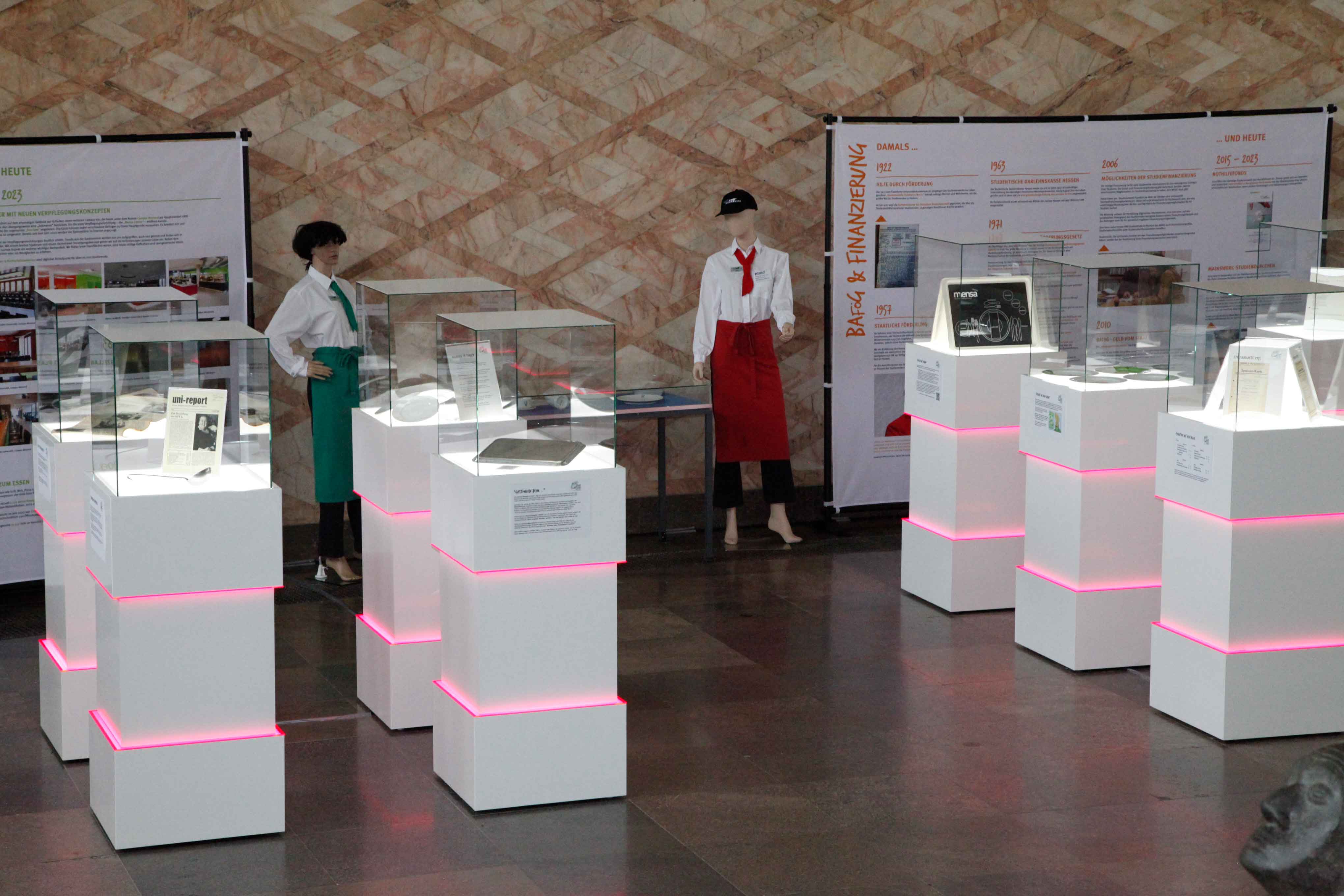 Umrahmt wird die Ausstellung von insgesamt fünf großen Stellwänden, die zu den Themengebieten „Wohnen“, „Essen & Trinken“, „Beratung & Service“, „BAföG & Finanzierung“ und „Über uns“ informative historische Fakten liefern und die Meilensteine des Studierendenwerks aufzeigen.