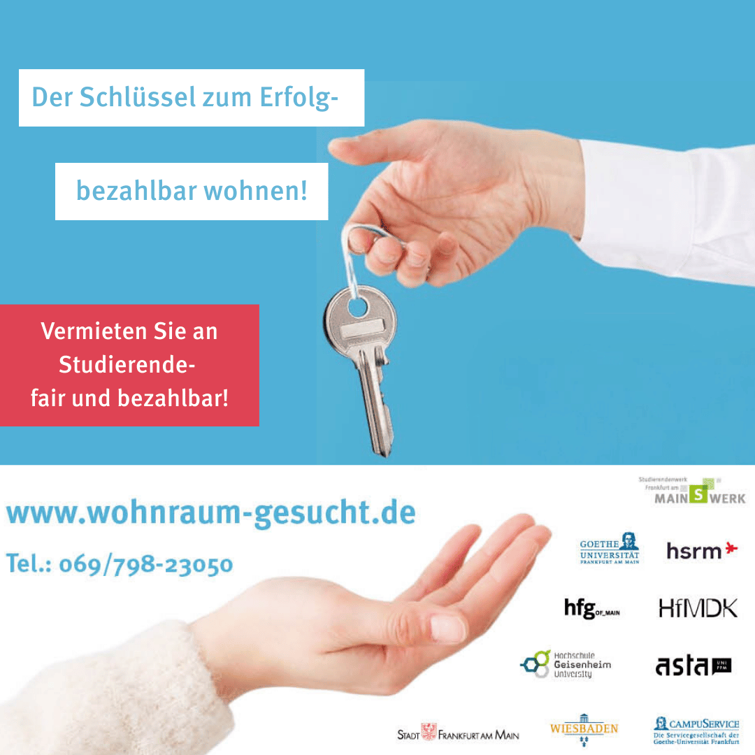 Das Portal www.wohnraum-gesucht.de ist das Herzstück der Kampagne. Hier können Vermieter*innen kostenlos und unkompliziert Angebote einstellen. Unterstützt wird die Initiative von den Hochschulen im Betreuungsbereich des Studierendenwerks, den ASten sowie den Städten Frankfurt am Main und Wiesbaden.