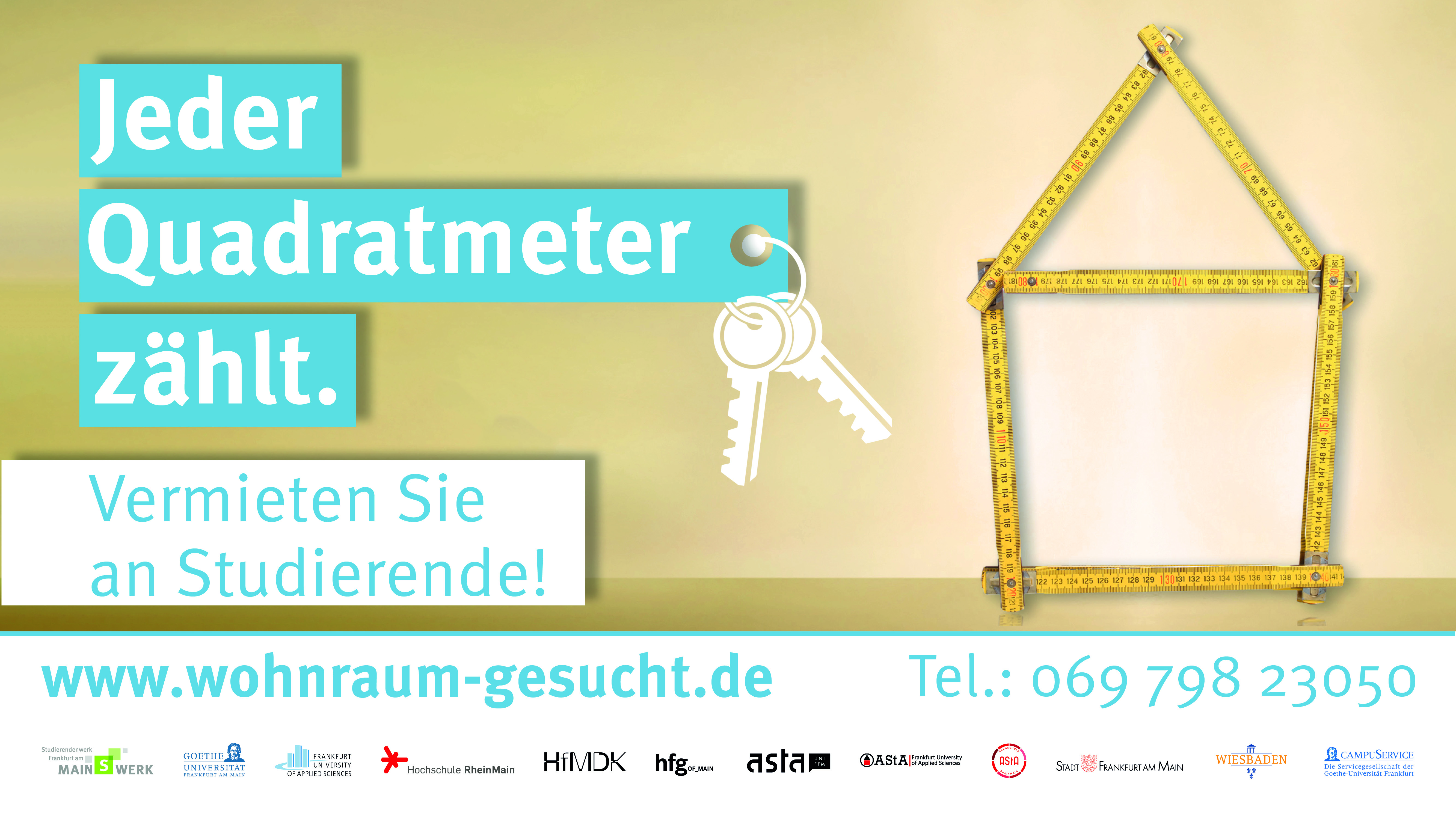 Aus diesem Grund rufen wir auch dieses Jahr wieder alle Bürgerinnen und Bürger im Rhein-Main-Gebiet dazu auf, bezahlbaren Wohnraum an Studierende zu vermieten. Die Größe des Wohnraums, die zeitliche Verfügbarkeit und die räumliche Nähe sind zweitrangig. Bei den wohnungssuchenden Studierenden, die gerade als Erstsemester am neuen Studienstandort starten wollen, sind alle Angebote willkommen.