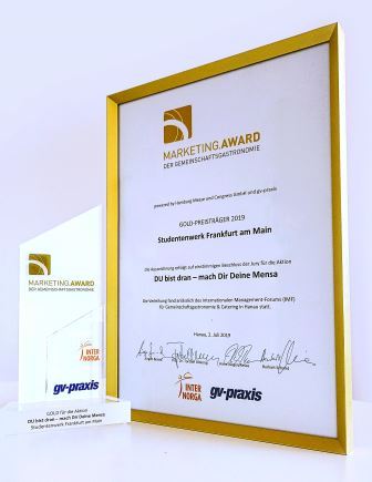 FRANKFURT AM MAIN – Das Studentenwerk Frankfurt am Main hat den „Marketing.Award der Gemeinschaftsgastronomie“ in Gold erhalten. Mit der Aktionsreihe „DU bist dran – Mach Dir Deine Mensa“ konnten wir uns gegen 40 weitere eingereichte Aktionen durchsetzen.