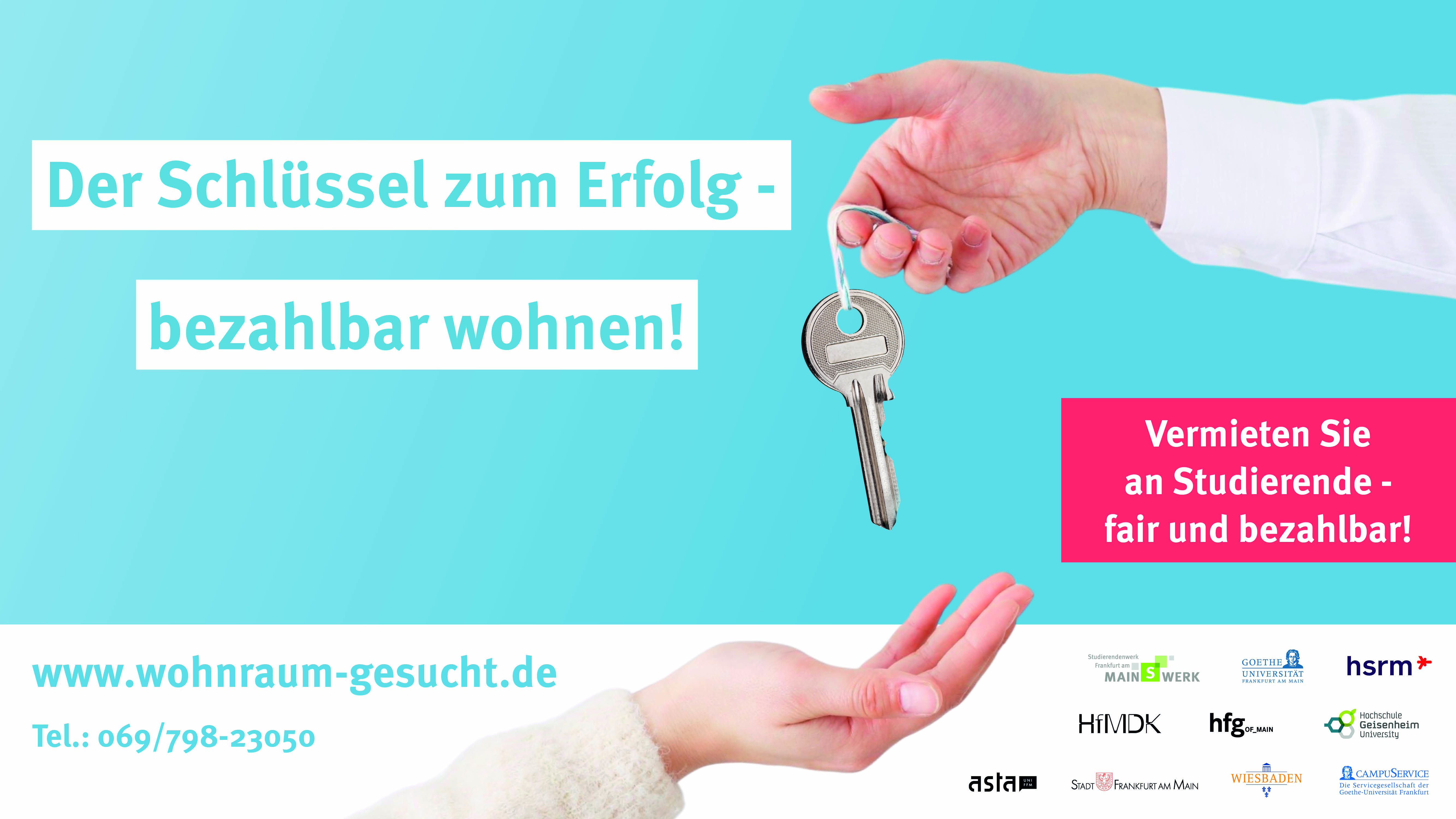 Das Portal www.wohnraum-gesucht.de ist das Herzstück der Kampagne. Hier können Vermieter*innen kostenlos und unkompliziert Angebote einstellen. Unterstützt wird die Initiative von den Hochschulen im Betreuungsbereich des Studierendenwerks, den ASten sowie den Städten Frankfurt am Main und Wiesbaden.