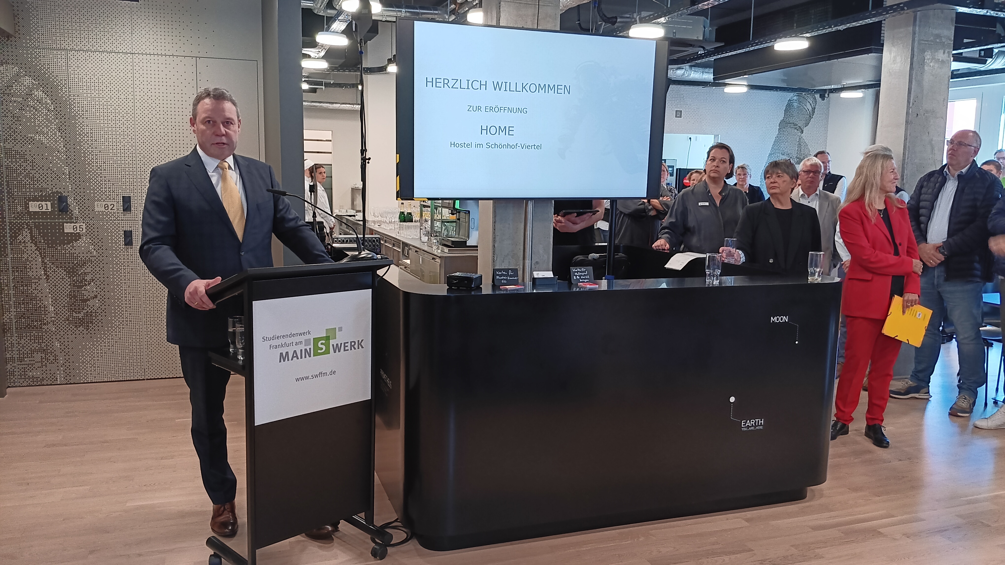 In einer feierlichen Veranstaltung hat das Studierendenwerk Frankfurt am Main heute das Hostel „HOME“ in der Nähe des Frankfurter Westbahnhofs eröffnet. Neben Gästen aus Politik, Hochschule, der Stadt Frankfurt am Main, des Deutschen Studierendenwerks und weiterer Institutionen staunte auch der ehemalige ESA-Astronaut Thomas Reiter über das aufwendig im Weltraumlook gestaltete Hostel.