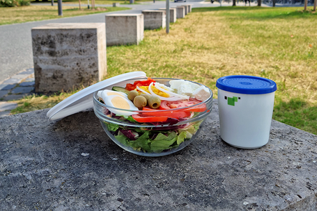 Um auch bei anderen to-go-Gerichten den Einsatz von Einwegplastik zu minimieren, können unsere Take-Away Salate in Pfandschüsseln mit dichtschließendem Deckel für 5 € Pfand mitgenommen werden.