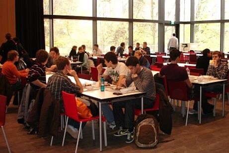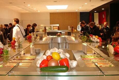 In der 2008 eröffneten Mensa gibt es täglich zwei Mittagsgerichte, außerdem haben Sie die Wahl zwischen Pasta-, Pizza-, Wok- oder Grillgerichten.