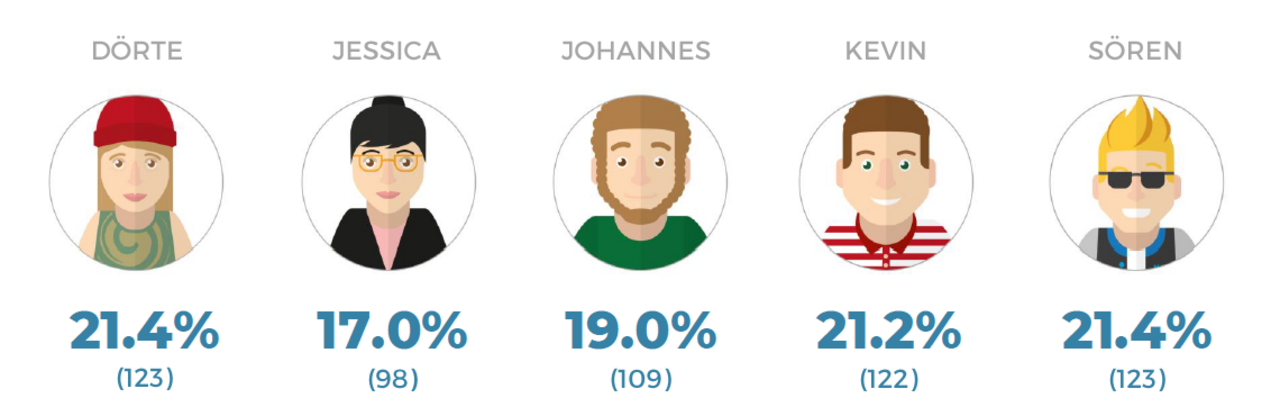 Jeweils 21,4 Prozent fielen auf Dörte, die Pragmatisch-Gehetzte und Sören, 21,2 Prozent gab es für Kevin. Johannes erhielt 19,0 Prozent und Jessica 17,0 Prozent. Den Prototypen eines typischen Studierenden scheint es zumindest nach unseren Umfrageergebnissen also beim Thema Ernährung nicht zu geben. Vielmehr verteilen sich die Stimmen recht gleichmäßig, was unseren Eindruck in den Verpflegungsbetrieben bestätigt.