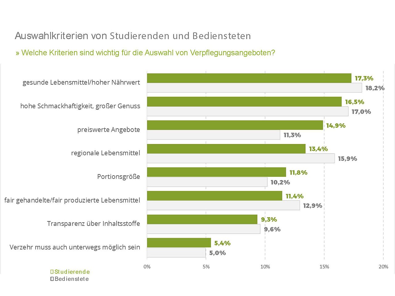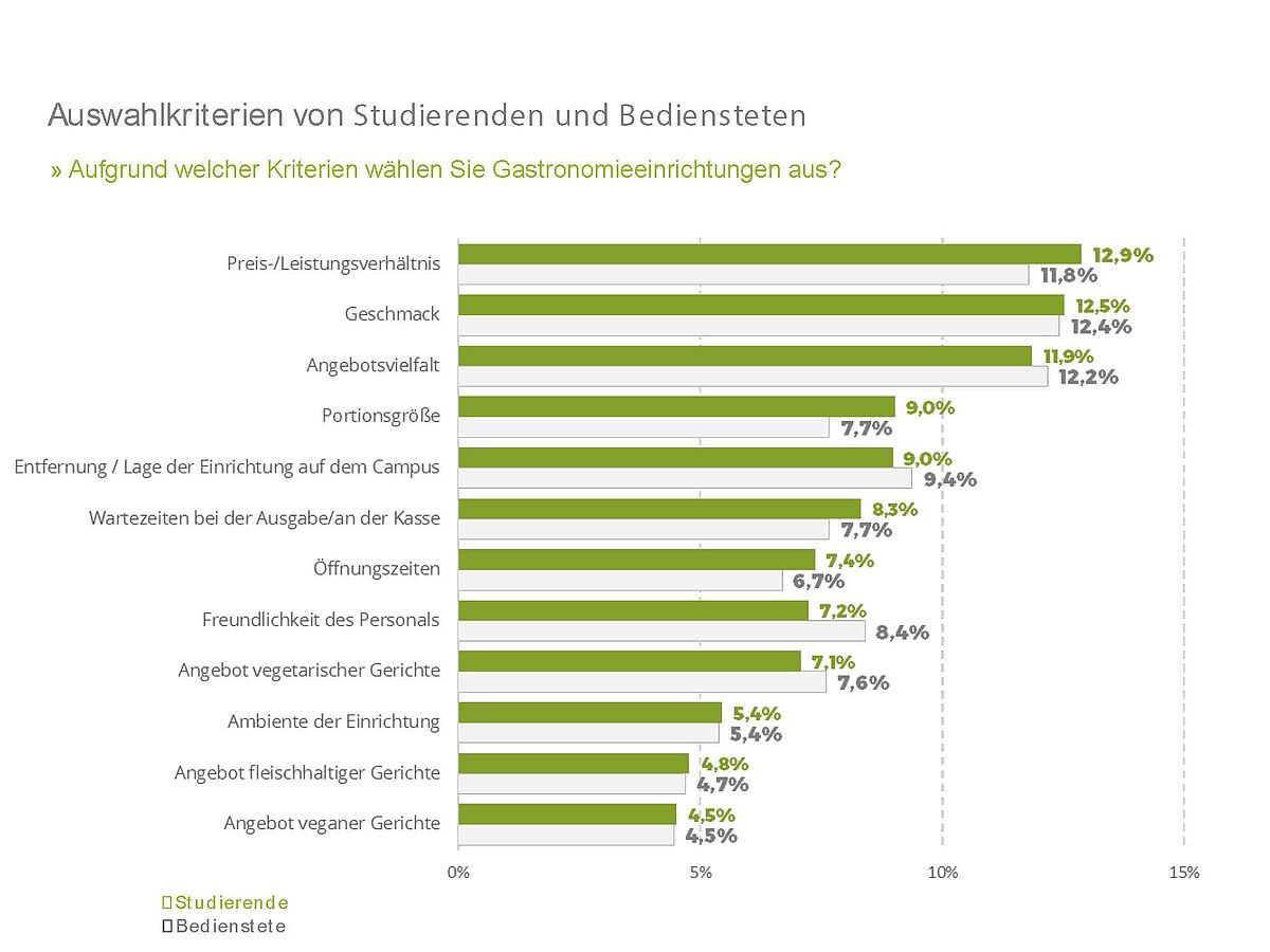 Eine Mahlzeit hat die größten Chancen auf den Teller eines Studierenden oder Bediensteten zu kommen, wenn sie gesund ist, einen hohen Nährwert hat und sehr gut schmeckt. Das geben 16,5 – 18,2 Prozent der Befragten an. Was nicht verwundert: Für die Studierenden sind preiswerte Angebote wichtiger als für Bedienstete (14,9 vs. 11,3 Prozent).