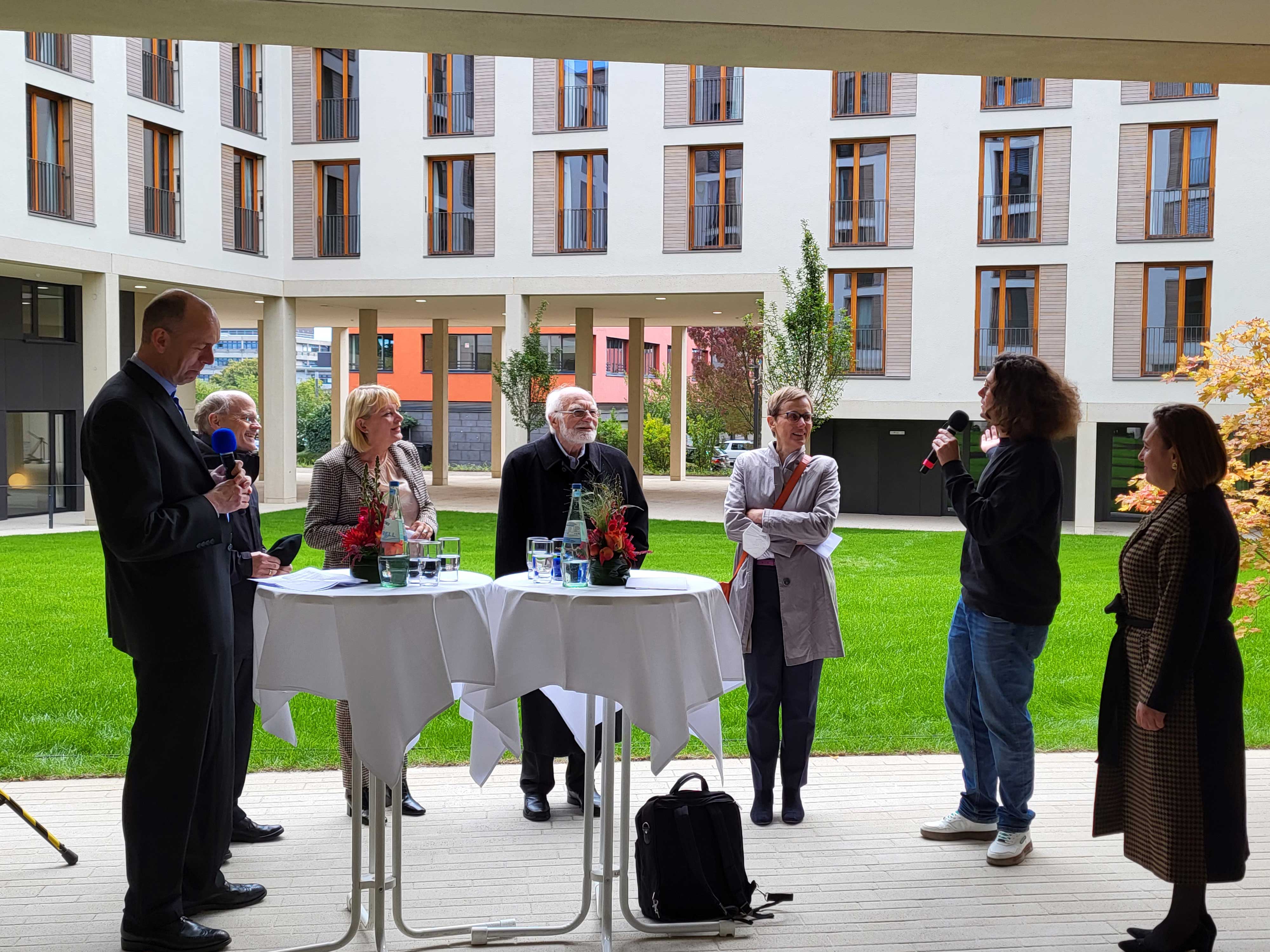 Heute wurde die offizielle Eröffnung im Beisein von Ayse Asar, Staatssekretärin im Hessischen Ministerium für Wissenschaft und Kunst, Mike Josef, Planungsdezernent der Stadt Frankfurt am Main, Prof. Dr. Enrico Schleiff, Präsident der Goethe-Universität, Prof. Dr. Andrea Klug, Stellv. Präsidentin des Deutschen Studentenwerks, Tim Hoppe, Wohnraumreferent AStA der Goethe-Universität, Prof. Dr. Jürgen Bereiter-Hahn, Vorsitzender des Stiftungsrates der Stiftung zur Förderung der internationalen wissenschaftlichen Beziehungen der Goethe-Universität, Dr. Enno Aufderheide, Generalsekretär Alexander von Humboldt-Stiftung sowie Konrad Zündorf, Geschäftsführer des Studierendenwerks Frankfurt am Main gemeinsam mit weiteren Gästen und den dort lebenden Studierenden gefeiert.
