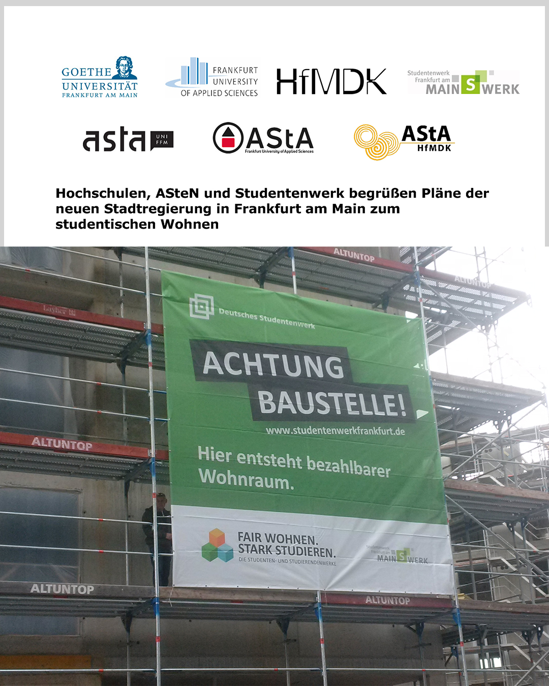 Die sieben Partner – Goethe-Universität Frankfurt am Main, die Frankfurt University of Applied Sciences, die Hochschule für Musik und Darstellende Kunst Frankfurt am Main, deren drei verfassten Studierendenschaften und das Studentenwerk Frankfurt am Main – begrüßen außerordentlich die Pläne der sich bildenden neuen Koalition zum bezahlbaren studentischen Wohnraum.
