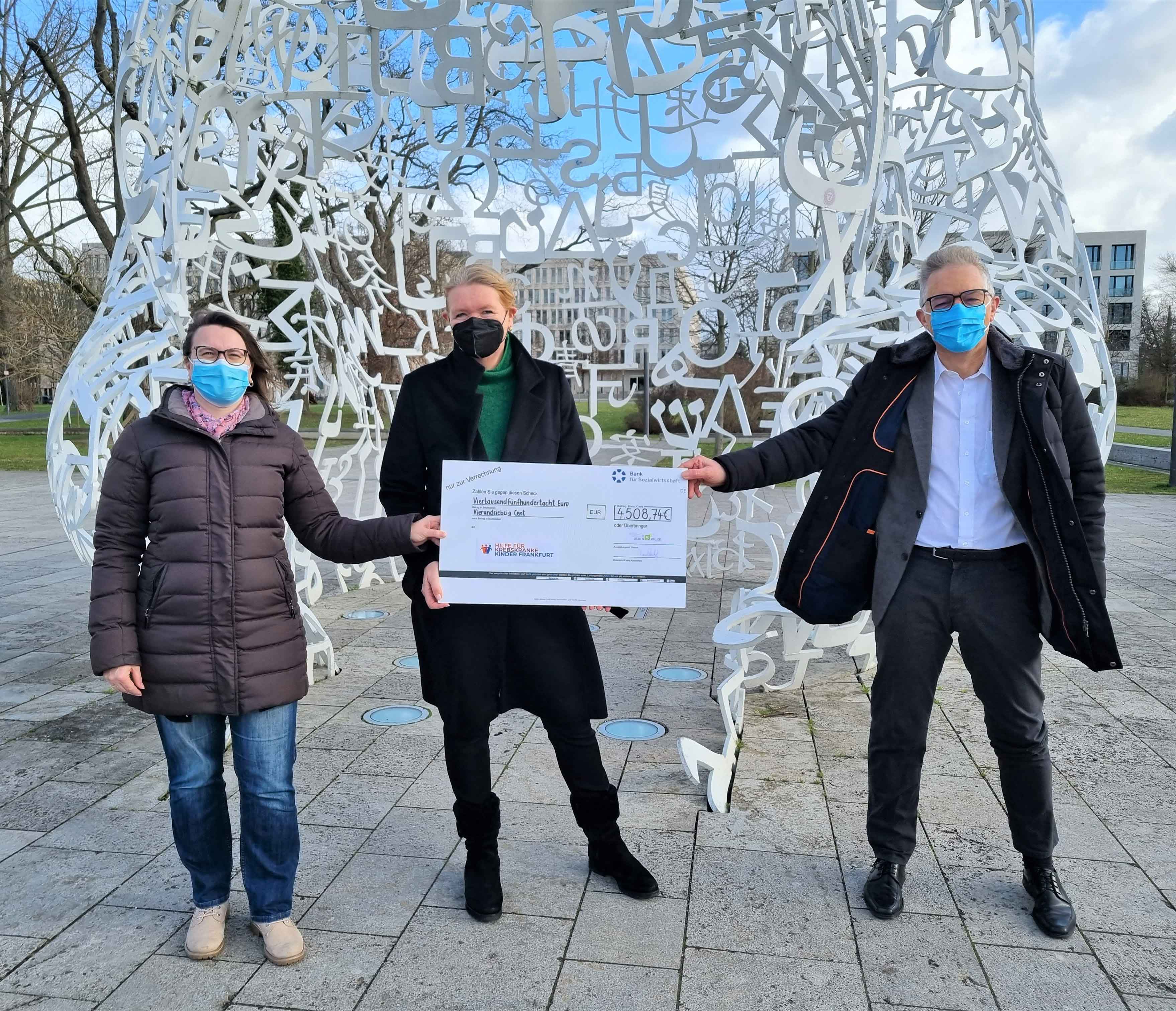 Überreicht wurde der symbolische Scheck in diesem Jahr persönlich, nachdem die Scheckübergabe letztes Jahr erstmals digital stattgefunden hatte. Konrad Zündorf, Geschäftsführer des Studentenwerks Frankfurt am Main und Sandra Adenböck, Personalratsvorsitzende, übergaben den Scheck, mit Maske und einen gebührenden Abstand einhaltend, auf dem Campusplatz an Karin Reinhold-Kranz, Vorstandsvorsitzende des Vereins. Diese nahm den Scheck ihrerseits entgegen und bedankte sich im Namen des Vereins herzlichst für die Spende.