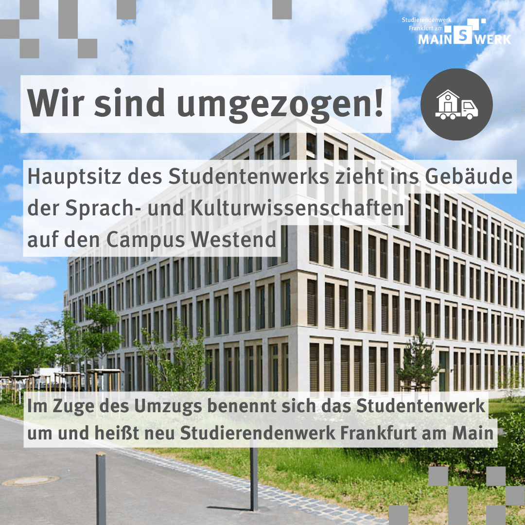 Mit dem Umzug verbindet das Studentenwerk auch noch einen zweiten Wechsel: Aus dem Studentenwerk Frankfurt am Main wird - ebenfalls zum 30. August 2022 – das Studierendenwerk Frankfurt am Main.