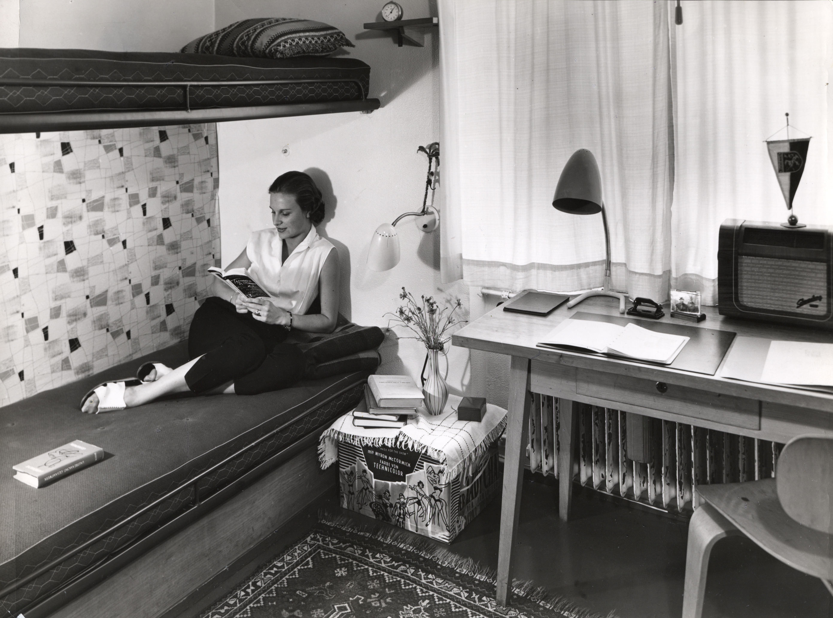 [Wohnheimzimmer 1954_CC_Universitätsarchiv.jpg] - [Wohnheimzimmer 2023_CC_Architekturbüro Ferdinand Heide_Heinen]